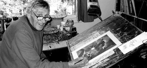 Below, a selection of black and white interior illustrations by Norem, showing his hand, his control over dynamics, his composition skills.
