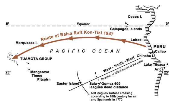 And so Heyerdahl and his companions did just that – built a balsa-wood raft following descriptlons found in Spanish texts, and sailed 5000 miles from Peru to Polinesia.
