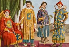 LLM456858 Chinese costumes – Emperor, Mandarin, and Military Mandarin by Scarpelli, Tancredi (1866-1937); Private Collection; (add.info.: Chinese costumes – Emperor, Mandarin, and Military Mandarin. Illustration for Storia de Costume dei Popoli by Paolo Lorenzini (Nerbini, 1934).); © Look and Learn; Italian, out of copyright