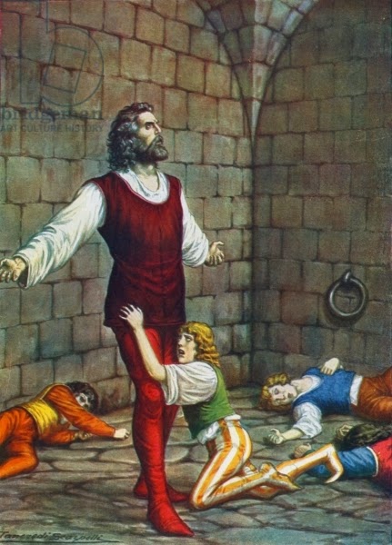 LLM454567 Count Ugolino della Gherardesca and his sons left to starve in the Muda by Scarpelli, Tancredi (1866-1937); Private Collection; (add.info.: Count Ugolino della Gherardesca and his sons left to starve in the Muda. Illustration for Storia d’Italia by Paolo Giudici (Nerbini, 1930).); © Look and Learn; Italian, out of copyright