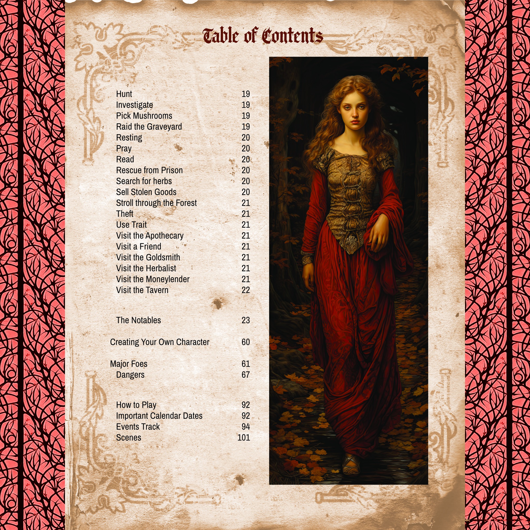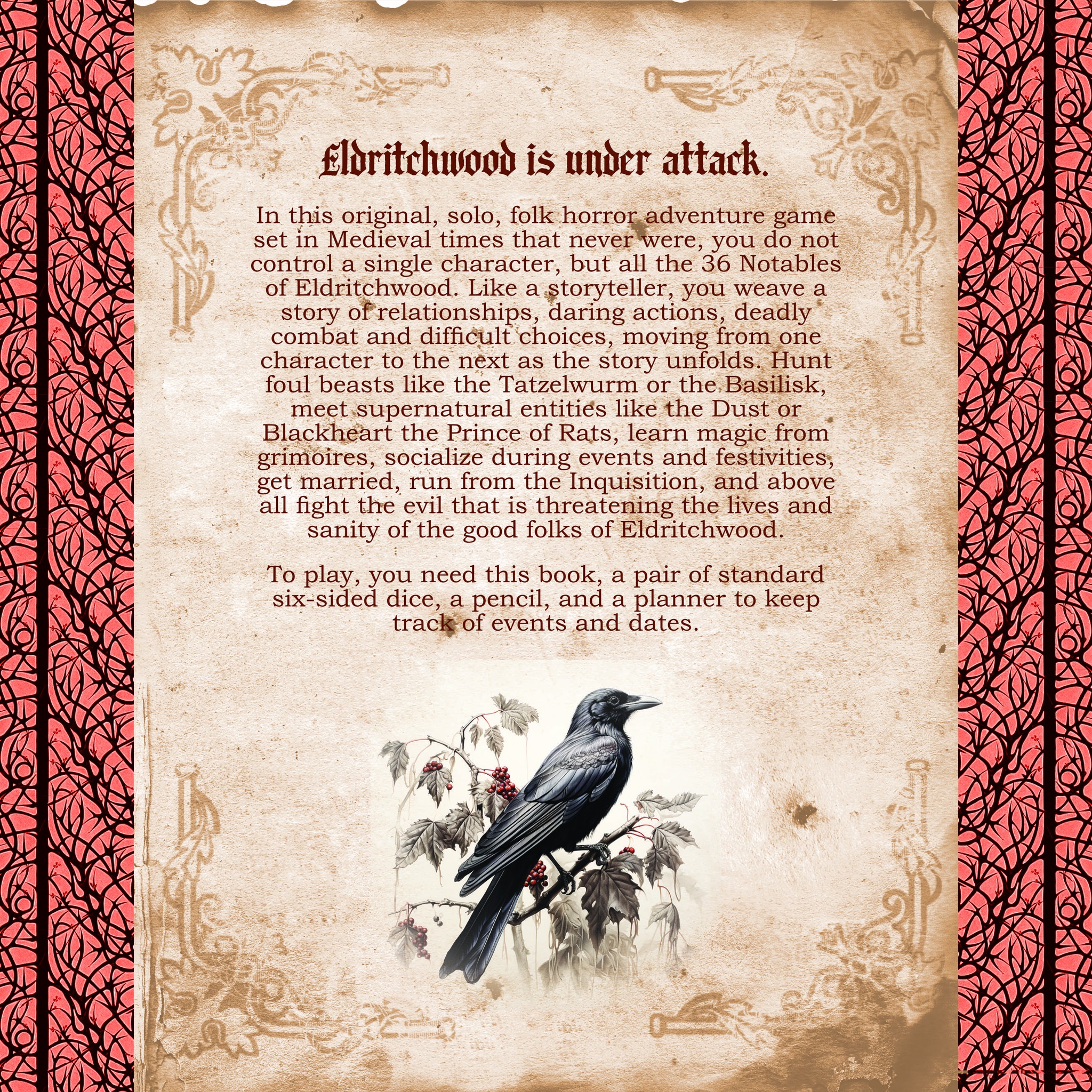 The basic premise is that the peaceful village of Eldritchwood is menaced by one of the numerous supernatural entities that live in the nearby woods. Dark deeds are afoot, and the good villagers have to investigate the occurrences, identify the bad guys, and find a solution.