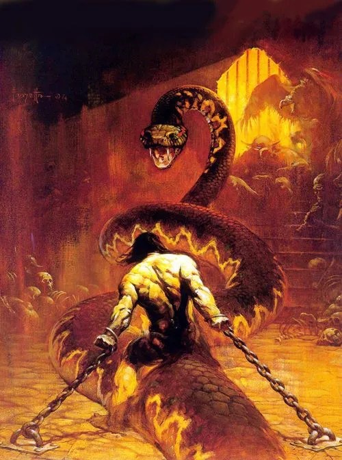 There are a number of reasons why I chose this story. I love the setting, the city of Arenjun in the nation of Zamora, and the disreputable neighborhood of the Maul, a kaleidoscope of peoples, deftly described in a single scene. I like young Conan as he tries to come to terms with civilization. There is a good deal of action, including a fight with a giant spider (together with giant snakes, quite a common specimen of Hyborian fauna). We also get a thumbnail summary of Hyborian history. And the whole third chapter, with Yag-kosha’s narration and death, and then Conan confronting Yara the Sorcerer to dish out some barbarian justice, is absolutely excellent.